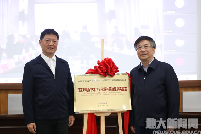 国家环境保护水污染溯源与管控重点实验室主任王焰新与长江生态环保集团李巍副总经理一同为实验室揭牌