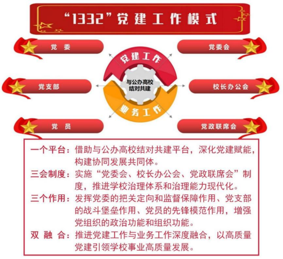 近年来,哈尔滨剑桥学院党委坚持以习近平新时代中国特色社会主义思想为指导,深入贯彻新时代党的建设总要求和新时代党的组织路线,锚定“深化党建引领赋能、促进‘一融双高’”目标,创新“1332党建工作模式”,将与公办高校结对共建作为提升办学治校水平、推动学校实现跨越式发展的“金钥匙”。学校主动对接北京大学、黑龙江大学等高水平公办高校,借助与公办高校结对共建平台,通过组织共建、载体同建、业务联建、品牌创建,推动资源共享、机制共创、发展共促,实现党建水平与办学质量双提升,形成公办、民办高校深化合作、协同发展的“剑桥样板”。学校共建品牌入选首批黑龙江省高校党建品牌,共建案例获第六届全国民办高校党建和思想政治工作优秀成果一等奖,共建经验入选《第28次全国高校党的建设工作会议经验材料汇编》,为深化新时代公办、民办高校结对共建提供了实践路径。