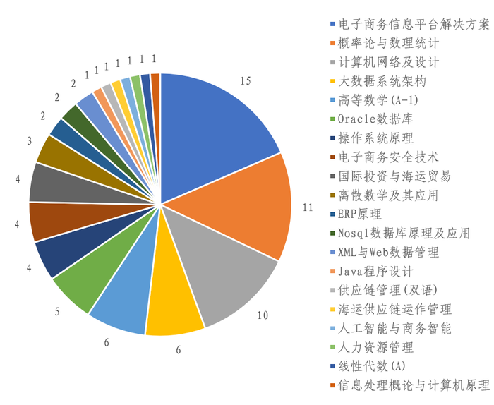 在2025-2026学年第1学期,某高校辅导员所带的221名学生共修读2589门次课程。在所有课程期末考核结束后,41名学生存在未通过的课程,占总人数的18.55%。学生考核通过2508门次课程,未通过的课程门次共81门次,未通过的课程门次占比3.13%。在学生未通过的81门次课程中,共涵盖了20门课程,如图2所示。