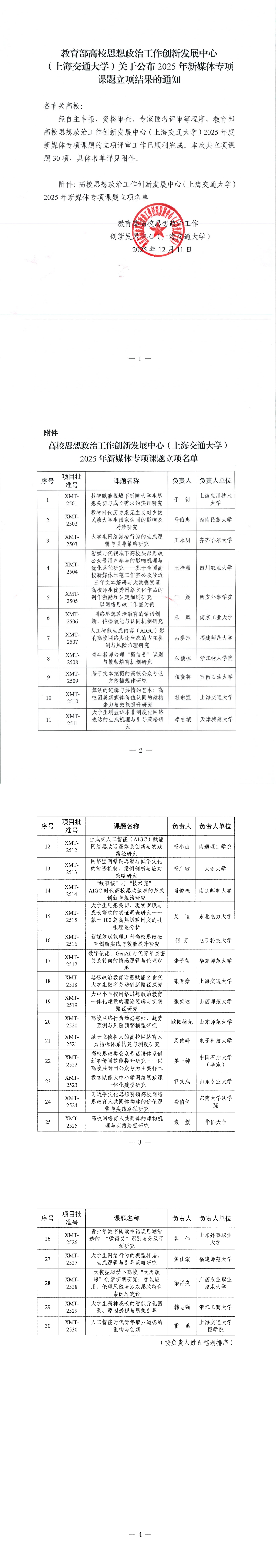 教育部高校思想政治工作创新发展中心(上海交通大学)关于公布2025年新媒体专项课题立项结果的通知