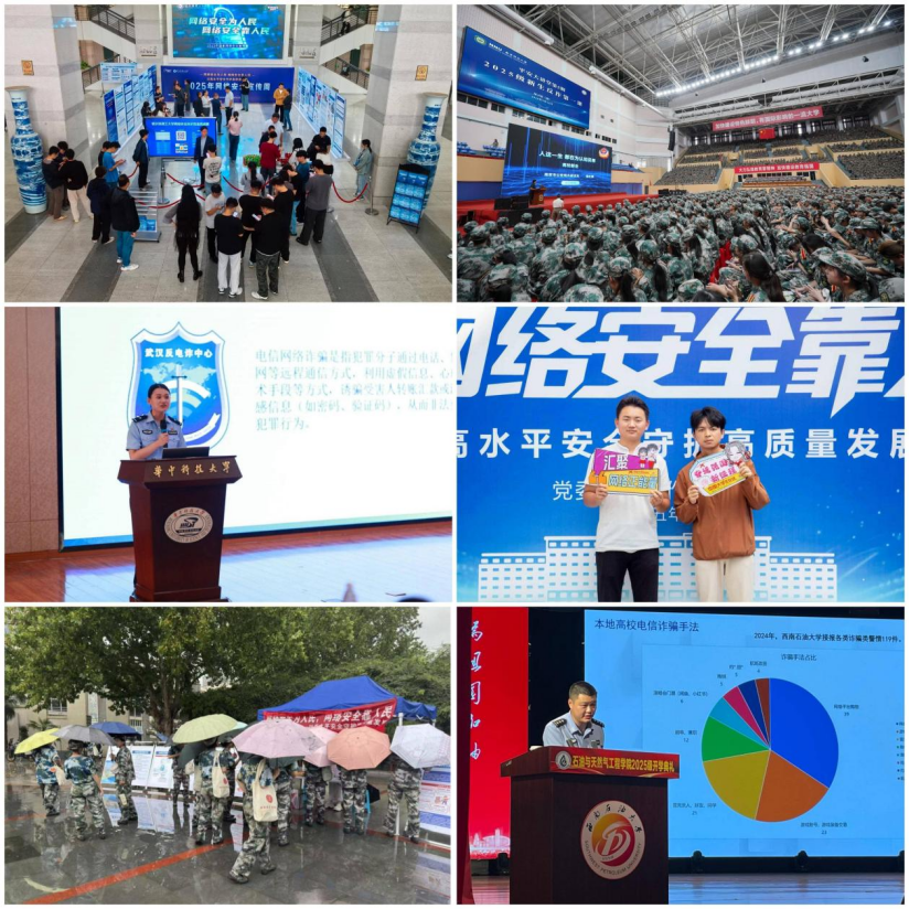 校园日当天,各地各高校也开启了丰富多彩的网络安全宣传周活动。哈尔滨理工大学通过参观展览、寻宝答题、盲盒挑战、应急演练等一系列内容丰富、形式新颖的宣传教育活动,吸引了众多师生踊跃参与,现场人潮涌动、气氛热烈,切实提升师生网络安全防护技能,营造清朗网络空间,为校园网络安全筑牢防线。南京师范大学组织5000余名新生收看“大中小学生反诈大讲堂”,并特邀南京市公安局内保支队首席反诈专家陈红燕警官主讲“平安大讲堂——2025级新生反诈第一课”,讲座聚焦高发诈骗类型,结合典型案例进行深度解析,现场互动踊跃,成效显著,为新生们上了一堂生动而深刻的“安全必修课”。华中科技大学完善AI辅导员“AI华导”智能反诈功能,广泛开展钓鱼邮件演练、网络安全众测大赛、线下学习等多种形式的主题宣传教育,提升师生安全意识,面向新生进行反诈防骗等主题授课,网安学院充分发挥专业优势组织学习助力校园网络安全建设。合肥工业大学邀请安徽省公安厅刑事侦查总队警官、合肥市公安局刑侦支队副大队长进校开展防诈主题宣传讲座,分校区举办“汇聚网络正能量,争做校园好网民”主题国旗下的思政课。陕西师范大学设立宣传展览区,向师生现场发放《网络安全知识宣传手册》和活动纪念品,同时借助学校官方网站、电子显示屏、微信公众号等多种方式推送网络安全相关知识及法律法规,营造网络安全宣传周活动氛围。西南石油大学组织新生上好网络安全第一课、组织师生观看反诈大课、开展闯关答题活动,做到网络安全线上线下相结合,宣传教育课内课外全覆盖。