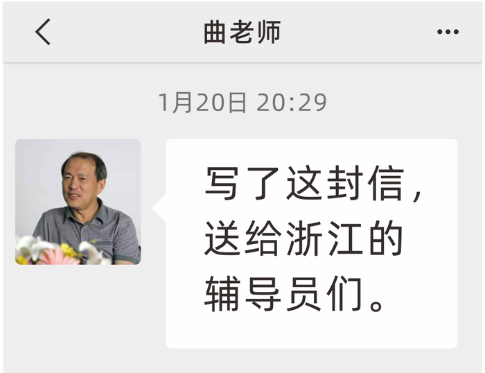 曲教授在得知浙江辅导员们的热烈反响后深受感动,提笔致信全体浙江辅导员,予以回应与勉励。