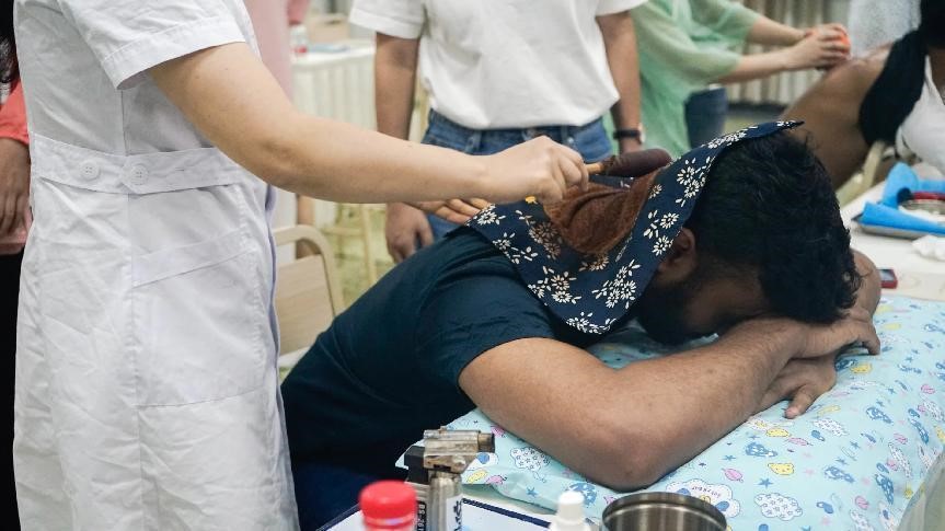 中外学生带着深厚的兴趣体验了一把火龙罐、棍针、温通刮痧等特色中医疗法。汉南兴奋地说:“中医是如此神奇,经过推拿按摩,感觉全身都轻松了。回国后我一定要向朋友们介绍中医药。”印度籍学生拉扎兴奋地比起了V字手势,表示很满意。