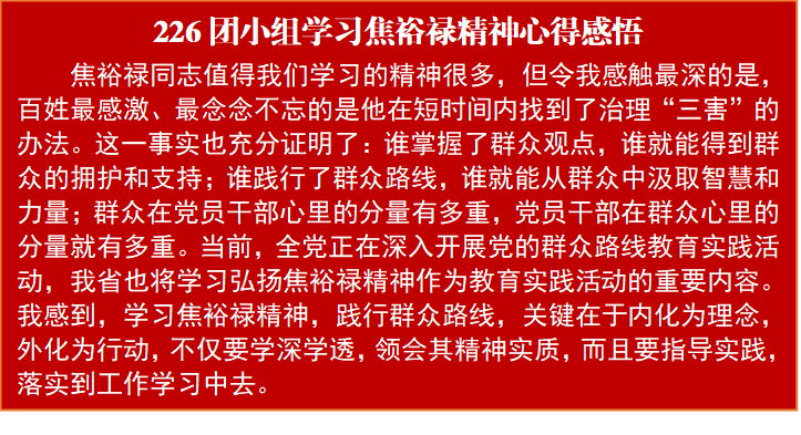 同学们总结学习成果,纷纷写下自己的心得体会。224寝室团小组表示,古人说,“意莫高于爱民,行莫厚于乐民”。我们学习和弘扬焦裕禄精神,就要牢固树立宗旨观念,始终坚持群众路线,认真落实以人为本,真正做到权为民所用、情为民所系、利为民所谋。学习焦裕禄精神,就是要大兴服务群众之风、艰苦奋斗之风、求真务实之风、知难而进之风、敬业奉献之风。现在我们国家强大了,各类事业也逐步发展壮大,改革工作正处于关键阶段,我们没有理由不像焦裕禄同志那样严格要求自己,对工作更要尽职尽责,情为民所系,利为民所谋,服务三农,职责所在。今后,我要在工作和学习中要学习焦裕禄同志艰苦奋斗、艰苦朴素、全心全意为人民服务的精神。