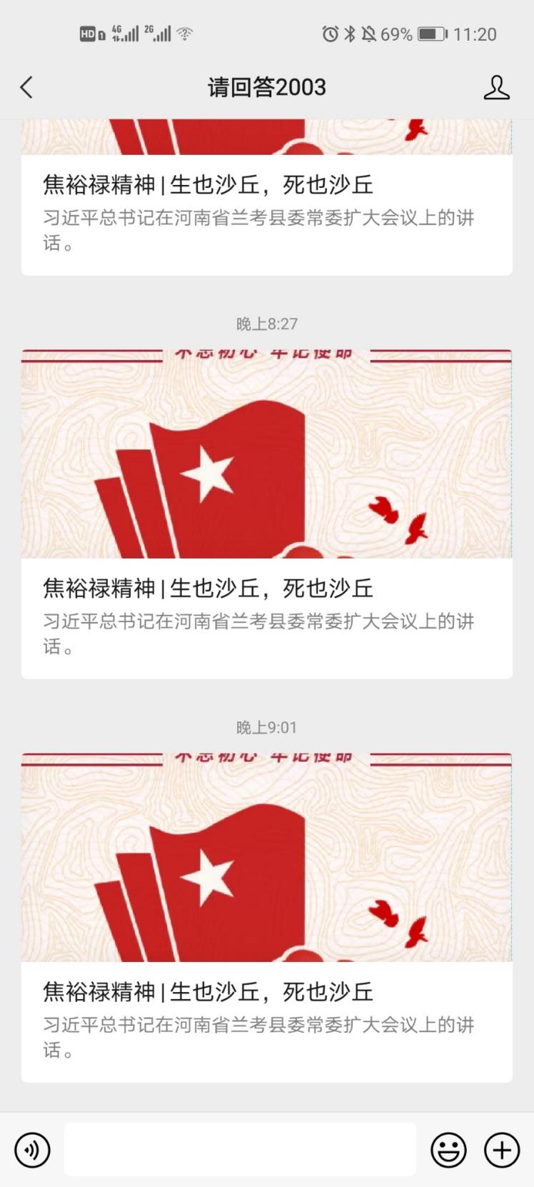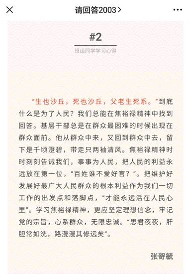 同时,班级公众号制作推文《焦裕禄精神|生也沙丘,死也沙丘》,转载习近平总书记2014年在兰考县委常委扩大会议上的讲话全文,并做编者按、附学习心得。