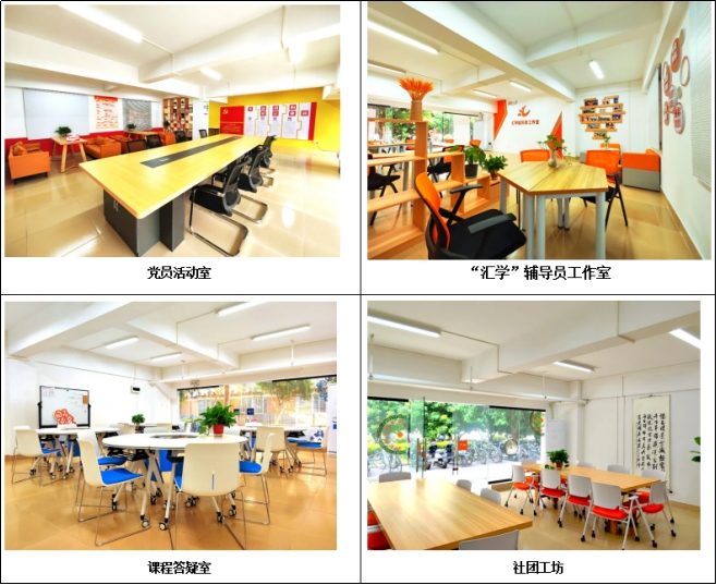 (一)整合多元复合空间。按照“大学生活动中心+东西校园+六个宿舍园区+N个功能室”的“一主两翼六站N室”学生社区设计思路,紧贴学生实际需求和使用频率,活化老校区宿舍架空层嵌入“一站式”学生社区,将2.5万m2公共物理空间场地划分为学习区、生活区、交流区、文体区等,包含学生活动室74间、学习室36间,覆盖学生总人数近4.4万人、楼宇76栋、宿舍近1.5万间。“一站式”智慧社区配套建设生活超市、公共洗衣房、共享厨房、自助打印机、无人零售店等设施场所,实现“商圈化”便利生活。借助人工智能优势,构建数字化社区云平台,实现共享空间预约使用“无纸化”管理。