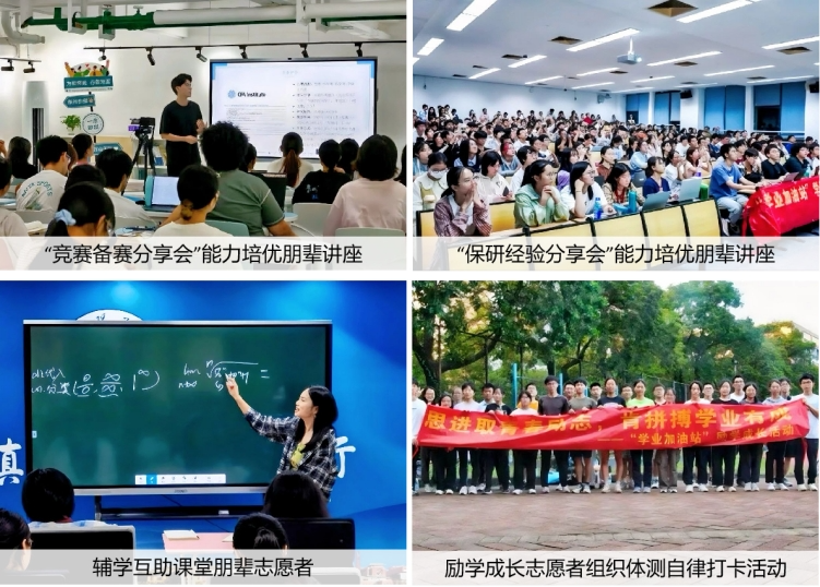 一是注重学业帮扶。建立朋辈帮扶中心,朋辈志愿者持续开展学习交流工作坊、学习兴趣小组、与学业困难学生结对子等活动,围绕学业互助、能力培优、励学成长等方面,每年开展“学业加油站”“朋辈课堂”等活动400余场次,参与学生1万余人次,让学生在互帮互助、互促互进中共同进步。