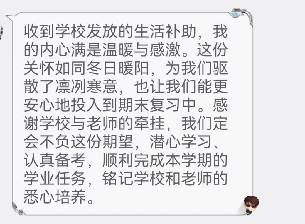 数据分析,默默资助。近日,小张同学的校园一卡通账户中悄然多出了500元,没有申请,没有评比,这份“默默的温暖”来源于学校对食堂消费数据、假期留校数据、医保缴费数据等多维度大数据的综合精准分析。2025年秋季学期以来,学校已为223名家庭经济困难学生、因心理问题或学业问题导致的需要关注资助的困难学生发放生活补助11.15万元,帮助学生缓解生活压力,让同学们好好吃饭、安心学习。