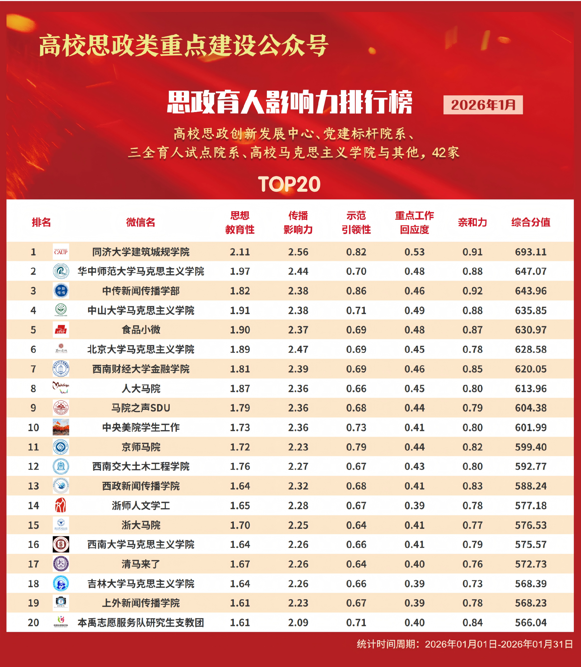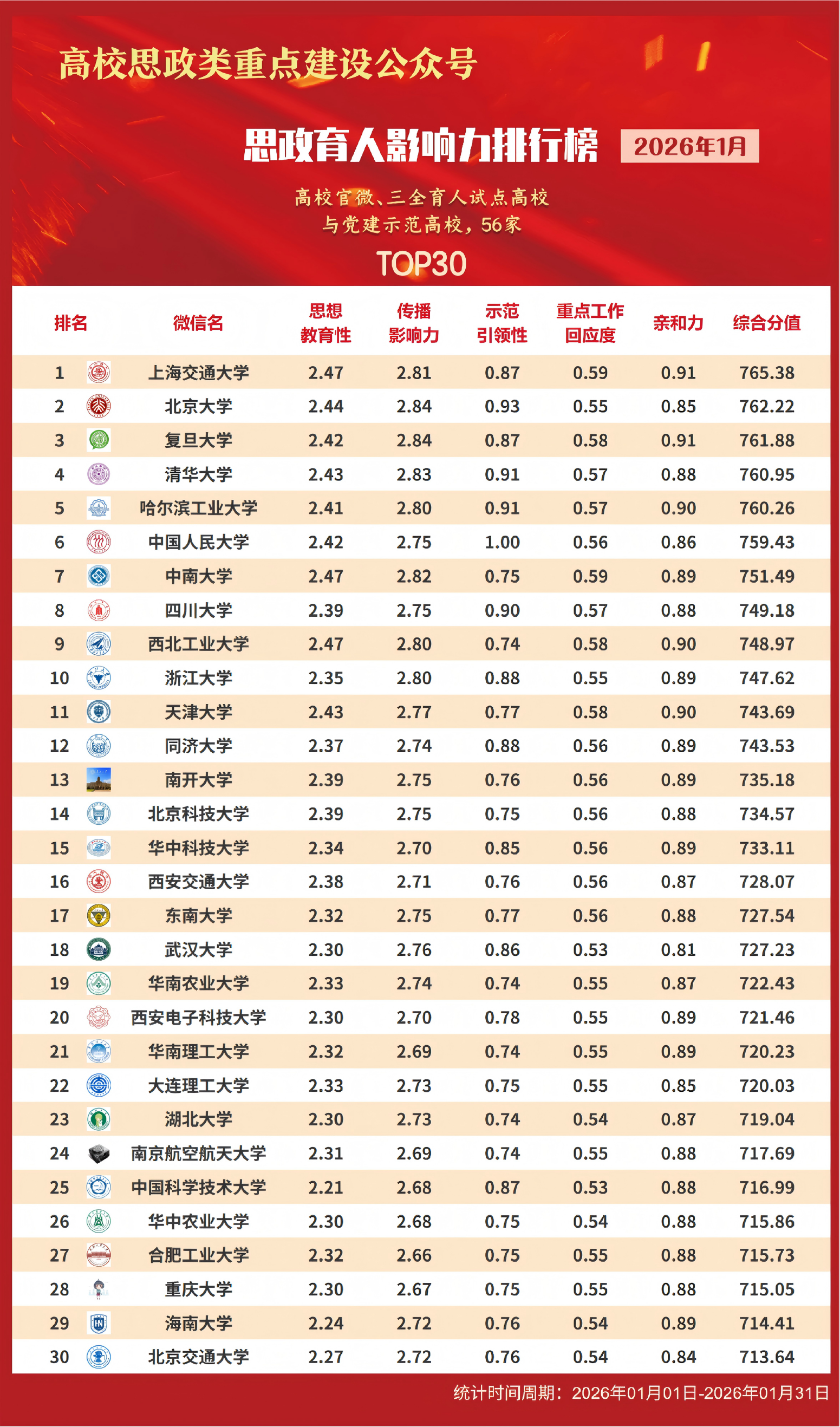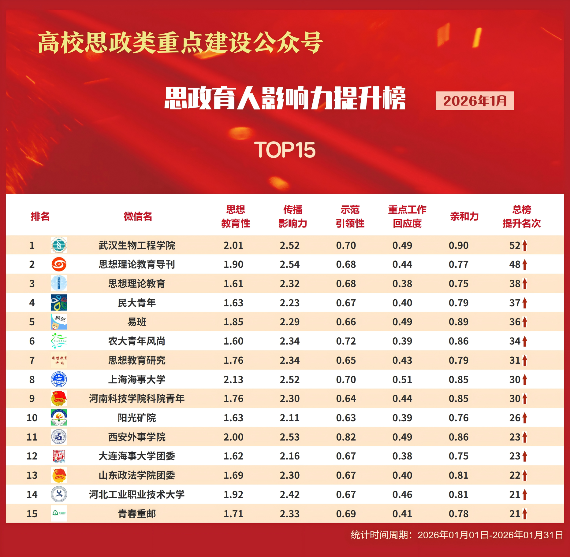 思政育人影响力排行榜、提升榜(2026年1月)
