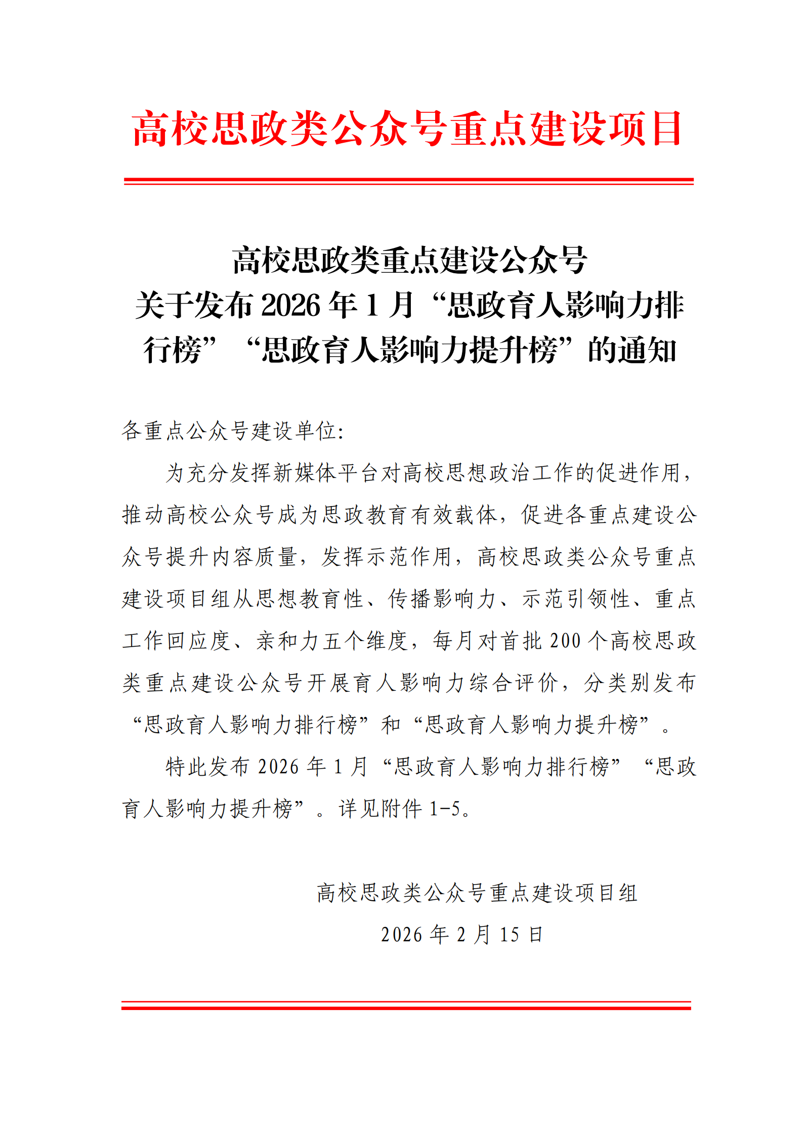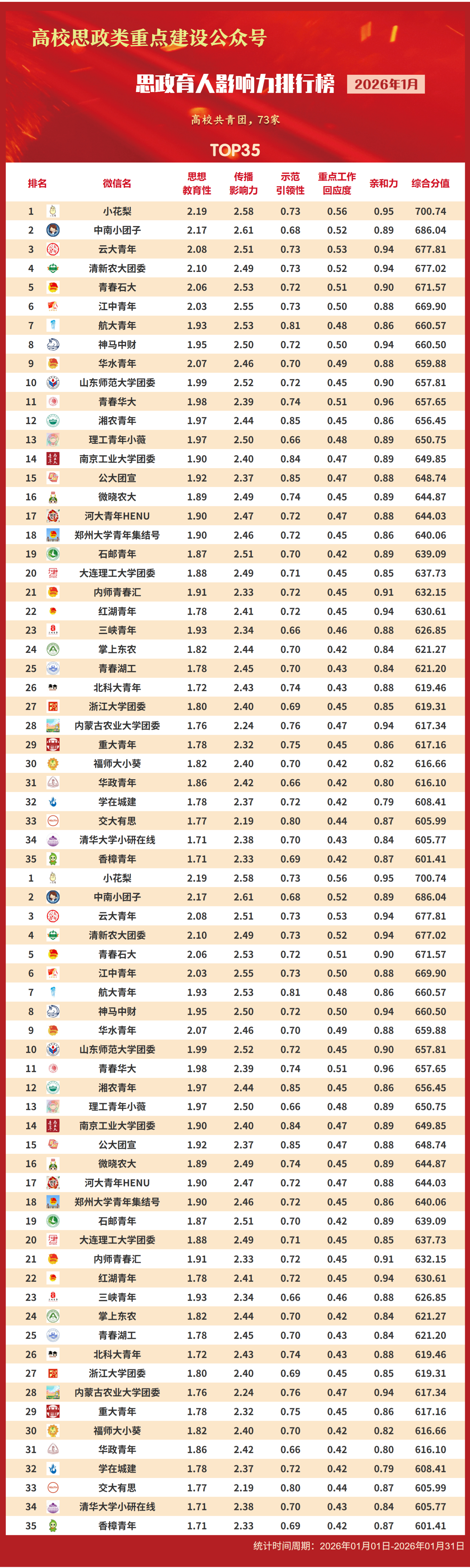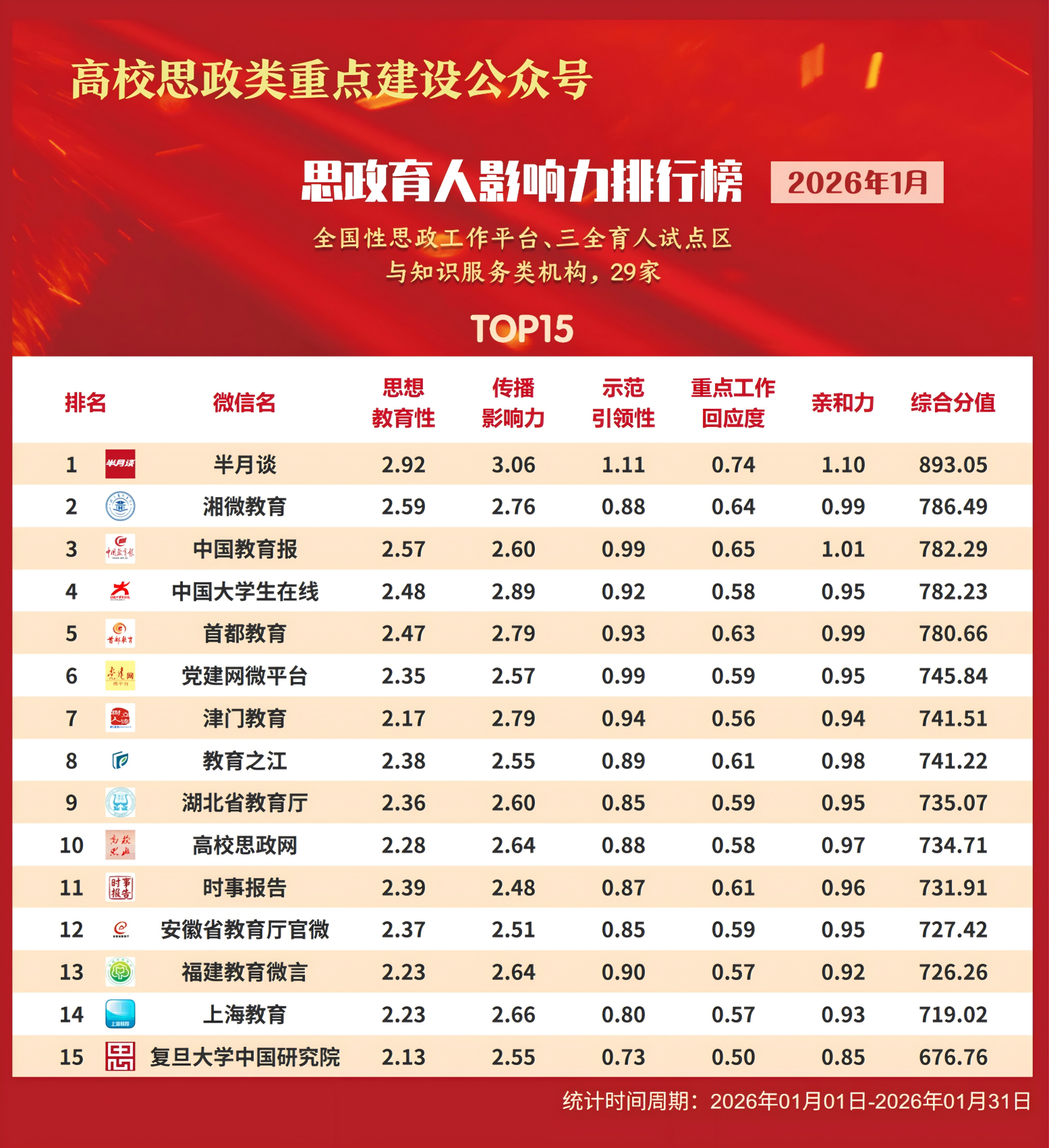 思政育人影响力排行榜、提升榜(2026年1月)