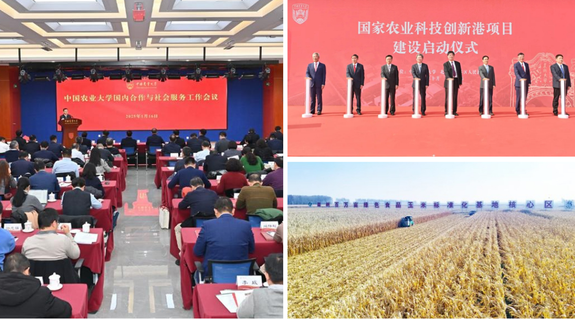 左图为中国农业大学国内合作与社会服务工作会议;右上图为国家农业科技创新港项目建设启动仪式;右下图为学校探索出黑土地保护利用 “梨树模式”。