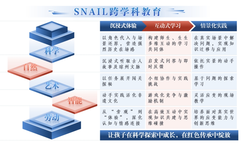 基于SNAIL跨学科教育理念,团队创新打造了“行走的跨学科思政课堂”特色体系。依托“科学+”SNAIL环岛科学驿、“琼山历史文化名城研学项目”和教育部中央彩票基金研学营地项目,联动海南13市县,构建了“SNAIL德育浸润课堂”“SNAIL槟榔BINGO系列活动”“三进书院”(科学探究+艺术体验+劳动实践)、“琼台寻福记”(自然感知+智能融合)、“鼓楼城墙守卫记”(跨学科团队协作)等特色课程,将海南的“最美公路”转化为“教育路”“科普路”,形成了13支“科学+”SNAIL环岛科学驿志愿服务团队的行走思政课堂网络。