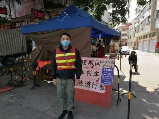 Ø 杨健海,继续教育学院19级室内设计2班学生,自2020年2月11日起,积极参加广州市番禺区石楼镇社区组织的疫情防控志愿服务工作。一句“辛苦了”让他顿时精神百倍,使命感更加饱满。好心市民的一瓶矿泉水更是滋润他善良、感恩的心灵。路人送给他们的口罩更是对他们最大的肯定和尊重。他总是说:“我做的只是一件很小的事情,为国家付出我们小小的一份力是我们当代年轻人义不容辞的义务。”