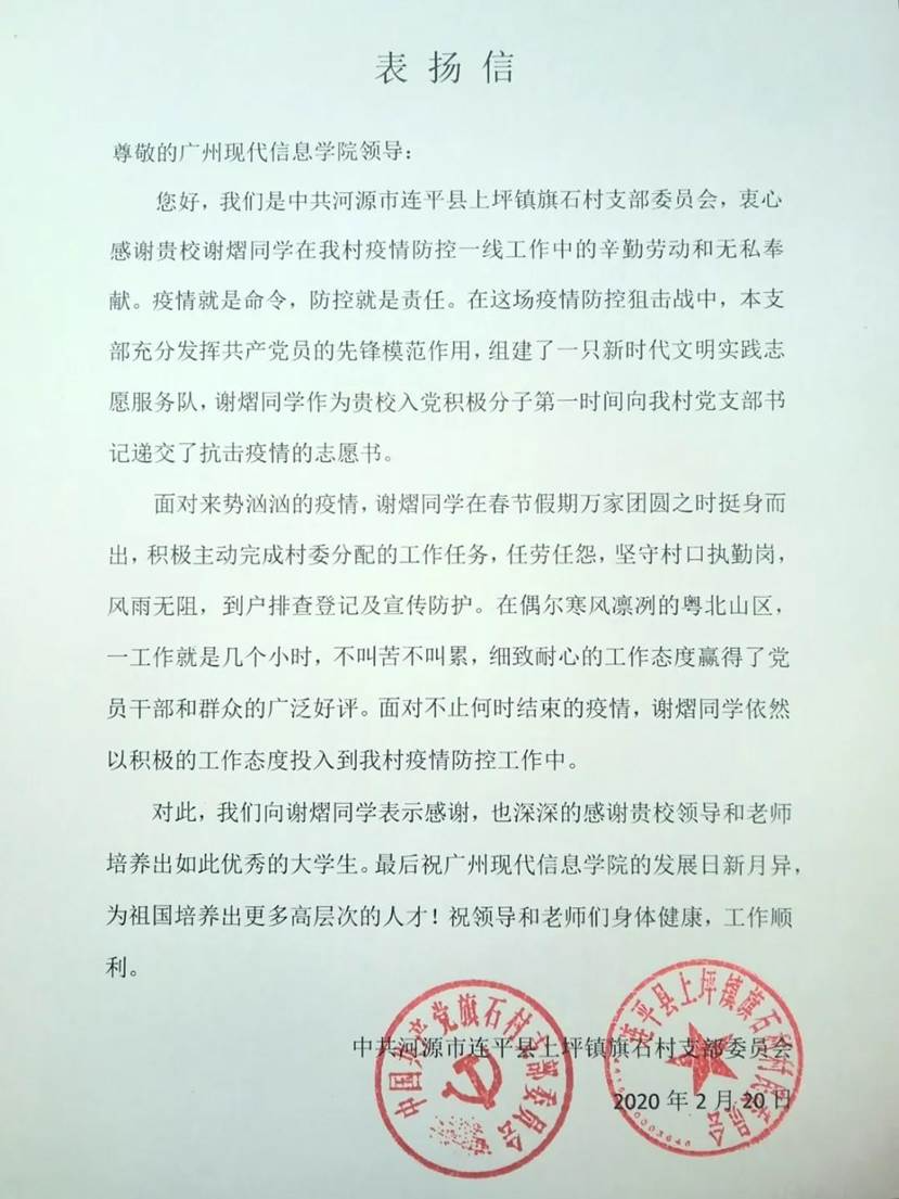 他坚守岗位、任劳任怨,获得了党员干部和群众的一致好评,村党支部、村委会也在第一时间给学院送来了感谢信,感谢学院培养了如此优秀的大学生。