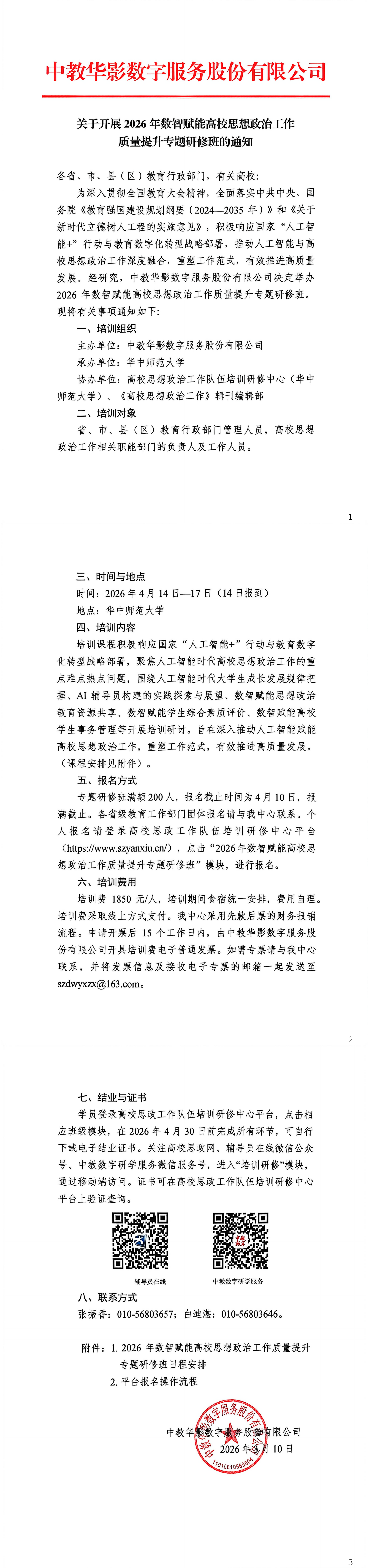 关于开展2026年数智赋能高校思想政治工作质量提升专题研修班的通知
