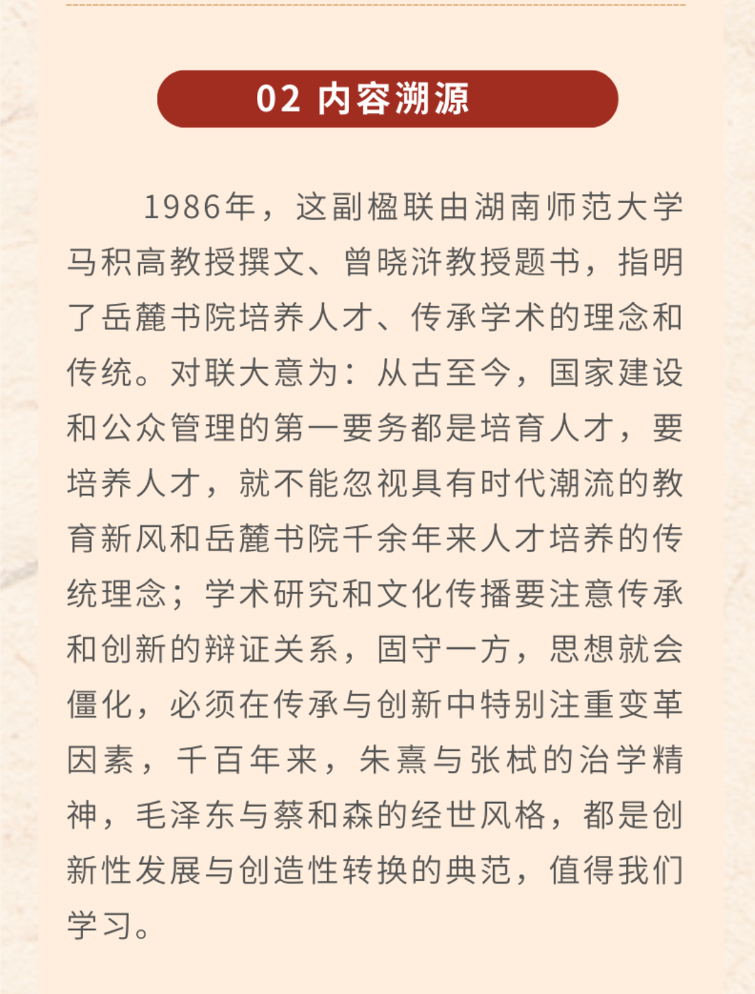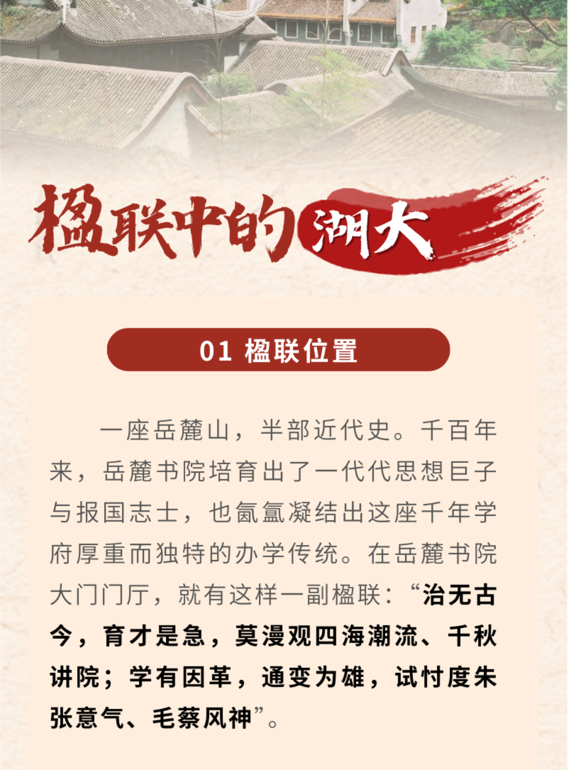 楹联是中国建筑的“门面”,将诗词与书法、篆刻相融合,是中华优秀传统文化的缩影和代表。岳麓山下、千年学府、弦歌不绝,留下了许多蕴含哲理、脍炙人口的楹联。