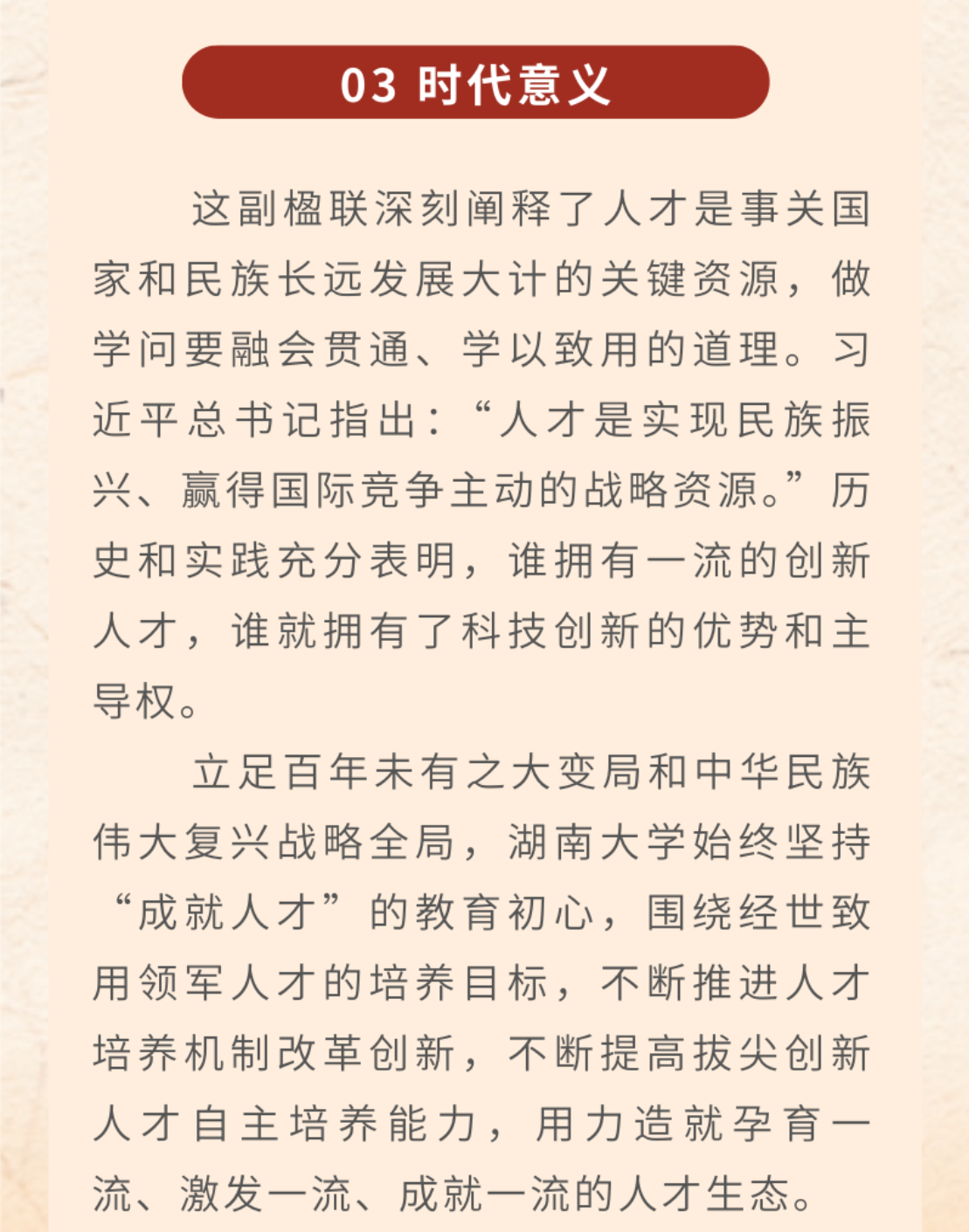 湖湘文脉、道贯古今。“楹联中的湖大”专栏以研究生视角讲述岳麓书院经典楹联背后的文化故事。学好书院文化、赓续红色血脉,在研读经典中矢志一流、追求卓越。