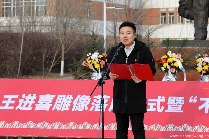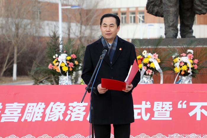 校党委书记孙明学讲话。他首先代表学校党委和全体师生,对铁人雕像完成过程中、对我校办学一贯给予全力支持的大庆油田公司领导、铁人家属及战友、油田文化集团公司等表示衷心的感谢。孙明学说,东北石油大学因油而生、因油而兴,与大庆油田同生共长、血脉相连,建立了全方位多层次产学研合作的密切关系。东北石油大学与大庆油田共建大庆精神、铁人精神育人基地,在校园内立起铁人雕像,是校企双方的共同心愿,是校企合作在共生、共进、共赢中取得的新成果。