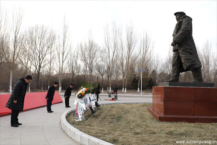 蒋明虎、王昆、王洪波为铁人王进喜雕像敬献花篮