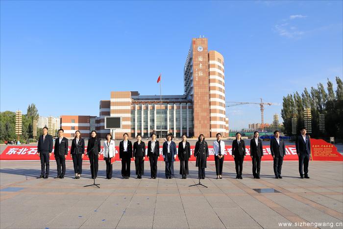 2019年9月25日,东北石油大学“不忘初心 牢记使命 我与祖国共奋进”主题团日暨第三届铁人文化节开幕式在图书馆广场举行。学校领导孙明学、蒋明虎、刘景顺、张斌、王树森、付晓飞、高洪峰、牟海维、于长青、郝丽红,党委常委、组织部部长张智勇,党委常委、宣传部部长徐清亮及各院部领导参加了此次活动。