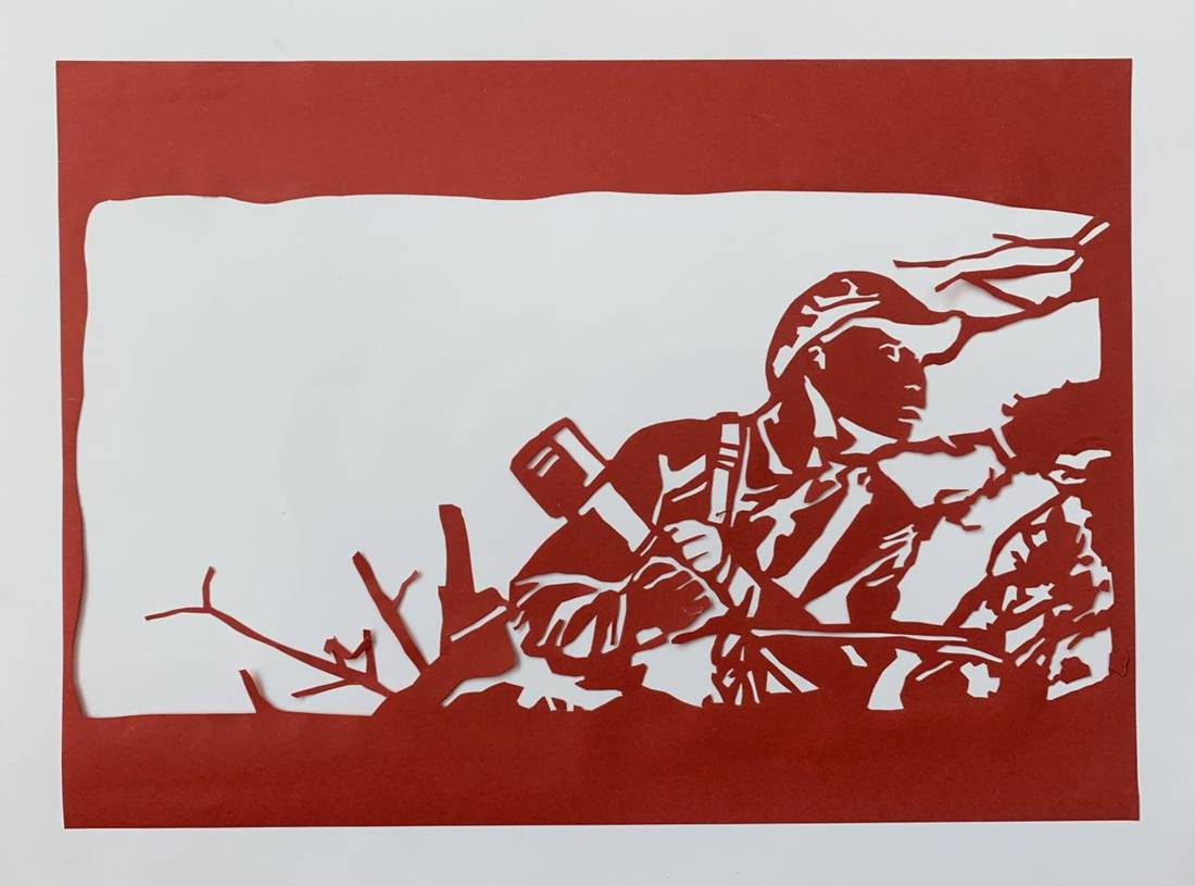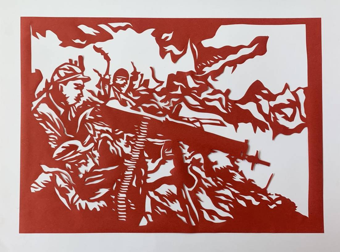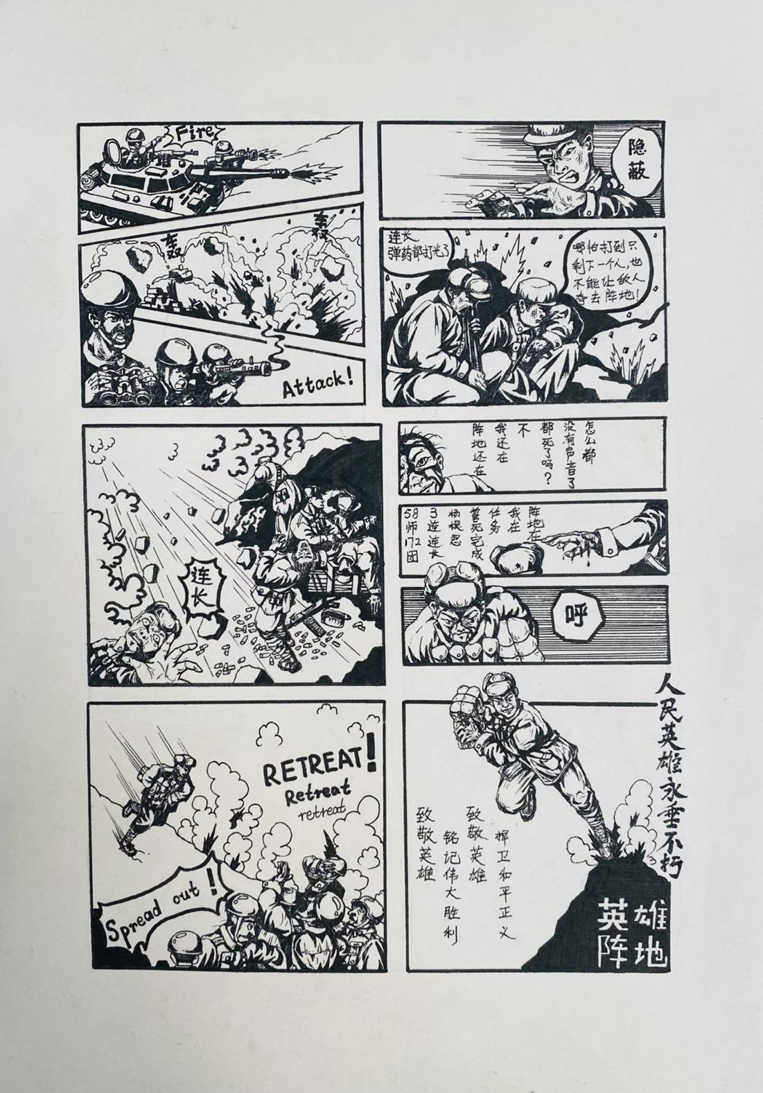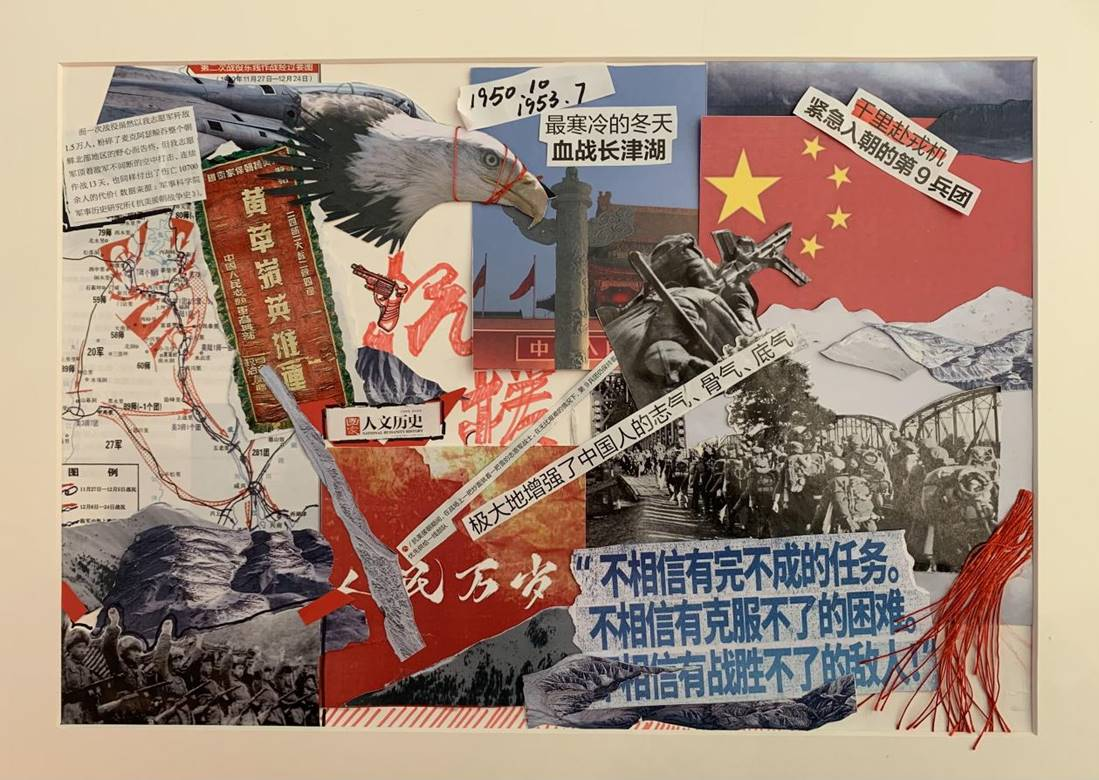 李芷菡则选择利用一些综合材料和杂志上剪下来的素材进行一个拼贴来创作场景,在观看《长津湖》这部电影后深有体会,杨根思为了完成坚守阵地的任务,战斗到最后只剩2名伤员和他自己,他坚持让两名伤员先撤退,他收集了阵地,上仅有还剩的武器,战斗到最后还剩一个手榴弹,抱着手榴弹冲向又涌上来的敌军,用自己的血肉之躯,坚守到生命的最后一刻,她用自己的画笔留下了那一光荣的瞬间。