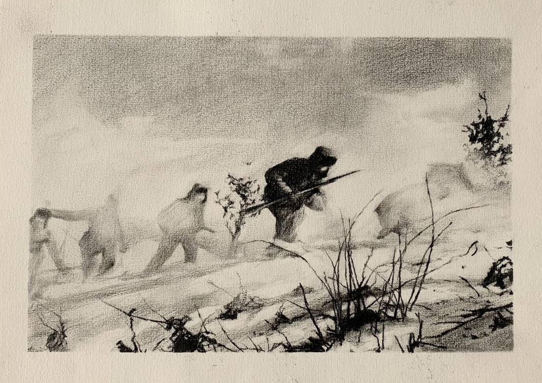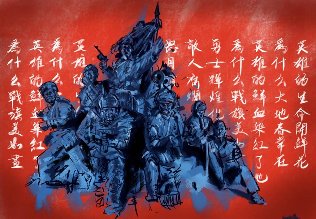 这次抗美援朝艺术作品展是一次美院学生自我教育的一次深刻呈现,学生们通过看历史、学历史、画历史,开展了一次刻骨铭心的精神洗礼。其中,参展的学生刘家龙选择了冰天雪地中战士们坚守战场的场景,寒风凛凛,大雪纷飞,在极寒的条件下,战士们为了躲避敌军的扫描,将自己埋在银白色的雪地中。这是因为他们心中有一股力量,这份力量可以与寒冷对抗,可以与冰雪相抵。这些战士们,他们就像大雪中的“腊梅”一样,用一颗颗赤诚之心书写着独属于中华民族的不屈。