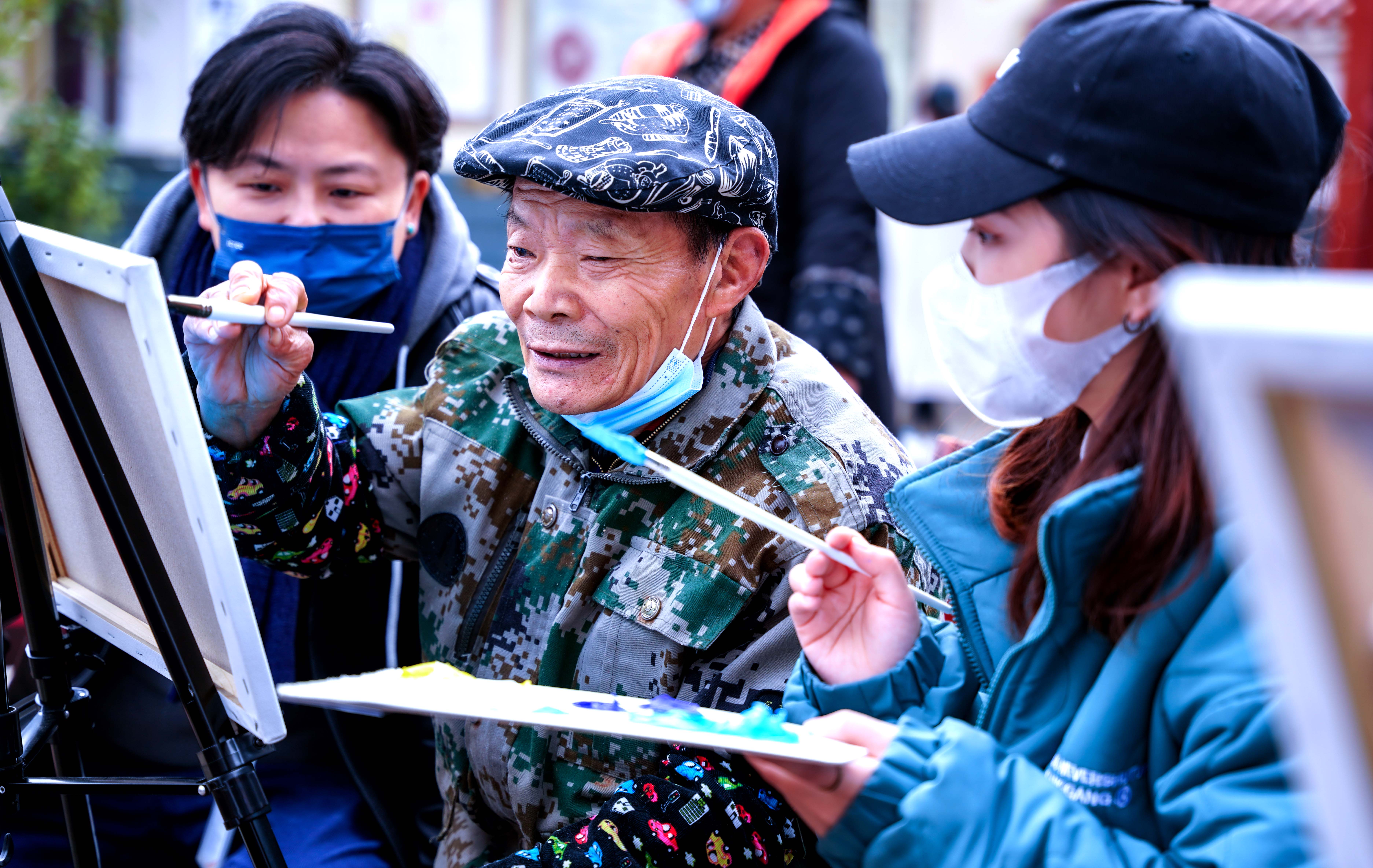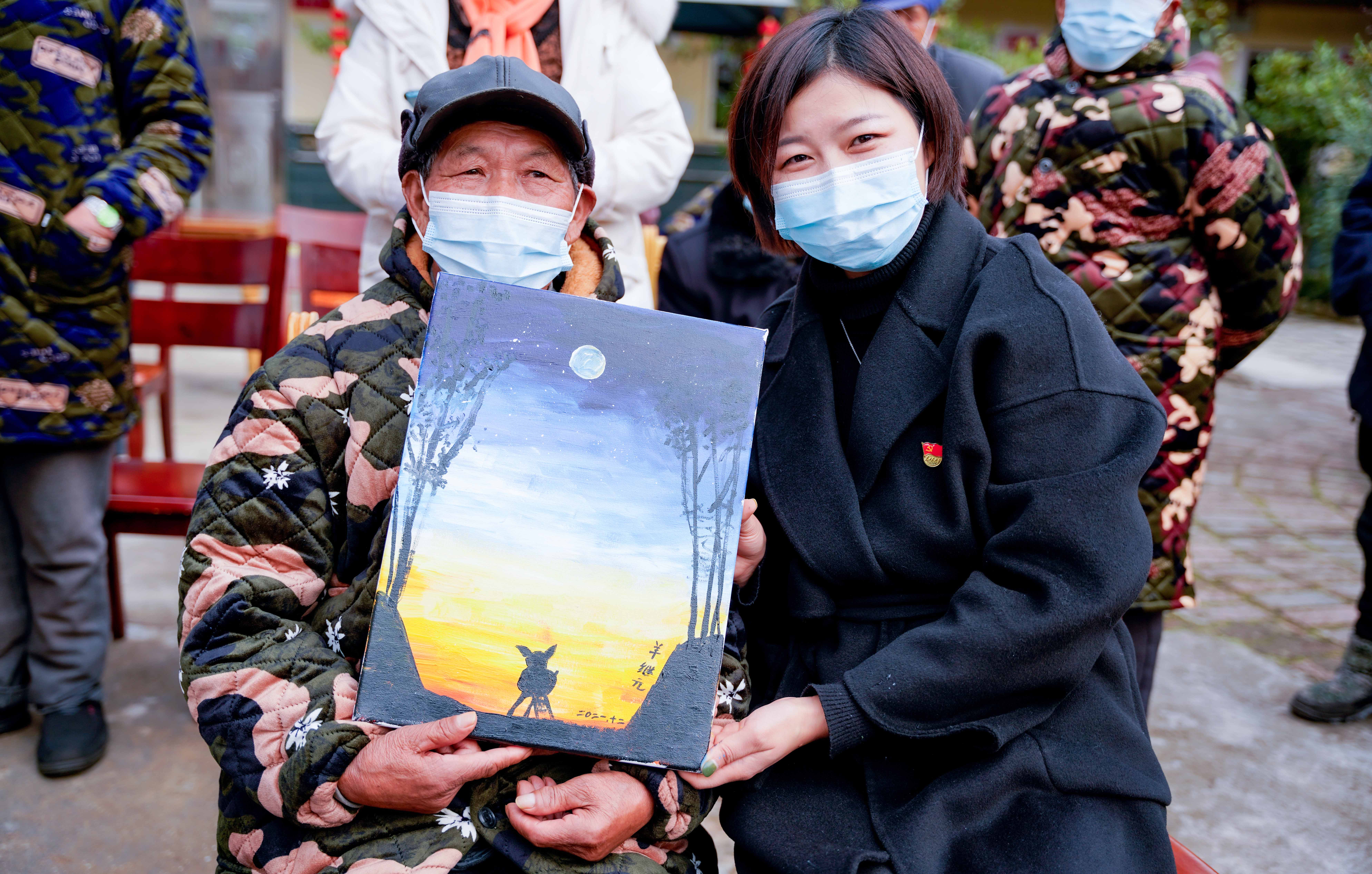 最后,詹书记代表学院给老人们赠送了牛奶、苹果等慰问品。师生党员们还为老人们表演了精心准备的文艺节目,老人们会心之处笑声、掌声不断。温暖的笑容顺着金色的阳光爬上了每位老人慈祥的面庞,师生党员们还结合自己的专业特长通过与老人共同作画的形式走进老人身边,促膝谈心,认真询问老人身体状况和日常生活状况,叮嘱老人照顾好身体保持良好心情。他们通过绘画记录下了冬日里敬老院这一温情时刻,整个养老院里洋溢着欢乐,涌动着暖流。