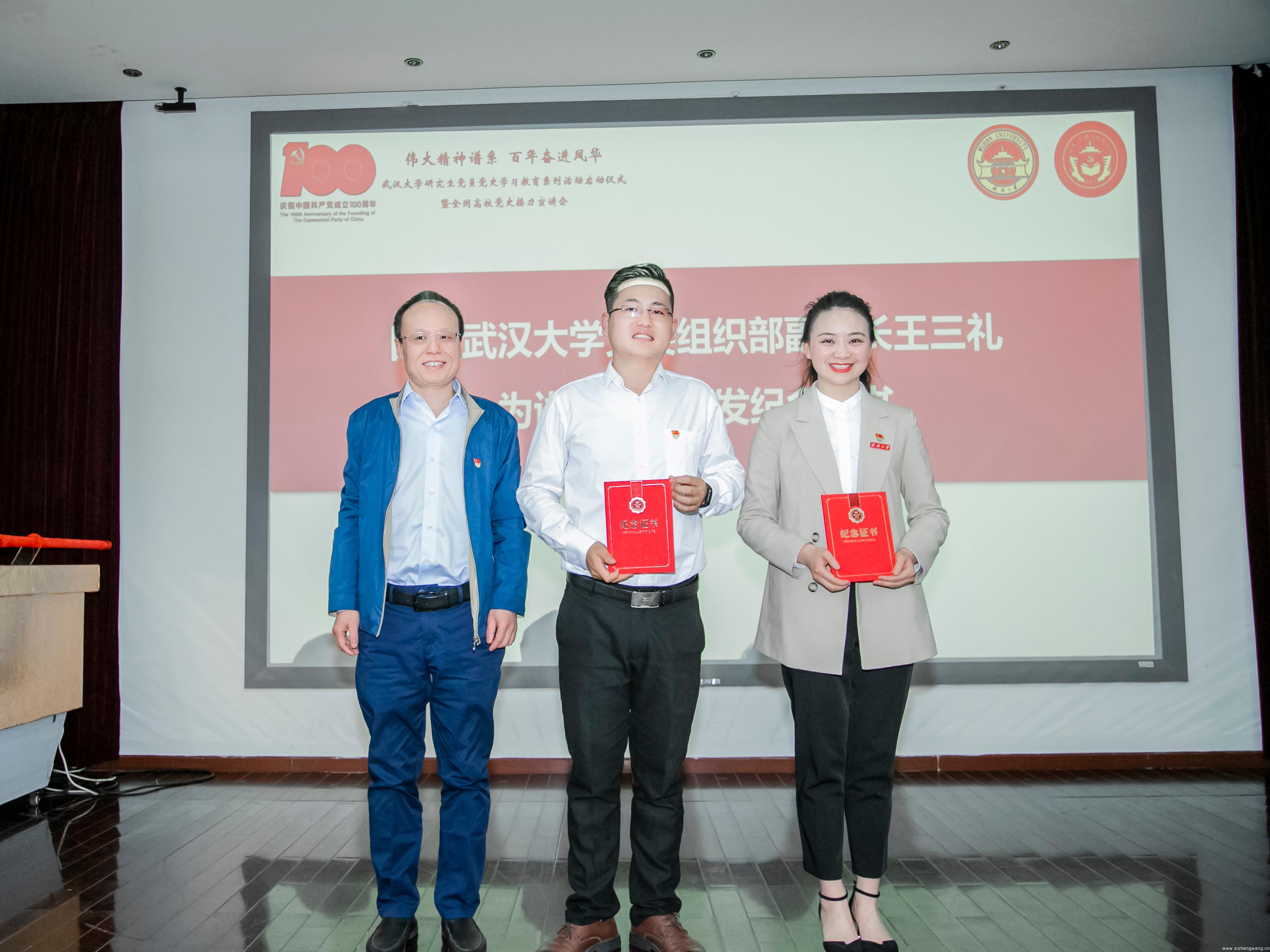 党委组织部副部长王三礼、党委宣传部副部长田贵华、党委研究生工作部副部长左征军分别为讲师代表和志愿者代表颁发纪念证书。