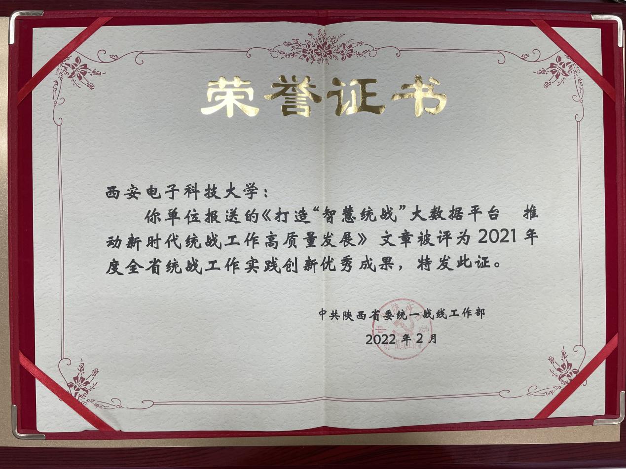 大会还表彰了2021年度全省统战理论研究、实践创新、宣传和信息工作先进单位和先进个人。西安电子科技大学等三所高校荣获2021年度全省统战工作宣传先进单位;西电报送的《以“打造智慧统战”大数据平台推动新时代统战工作高质量发展》文章被评为2021年度全省统战工作实践创新优秀成果,全省高校仅有三项成果获奖。