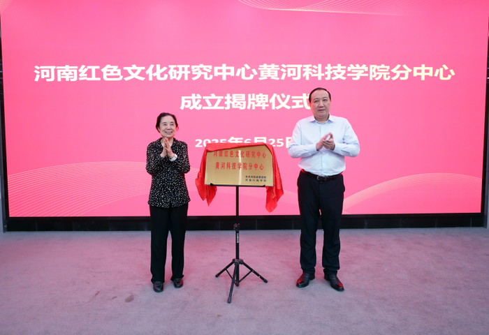 河南红色文化研究中心主任张涛和黄河科技学院董事长、党委副书记胡大白共同为分中心揭牌