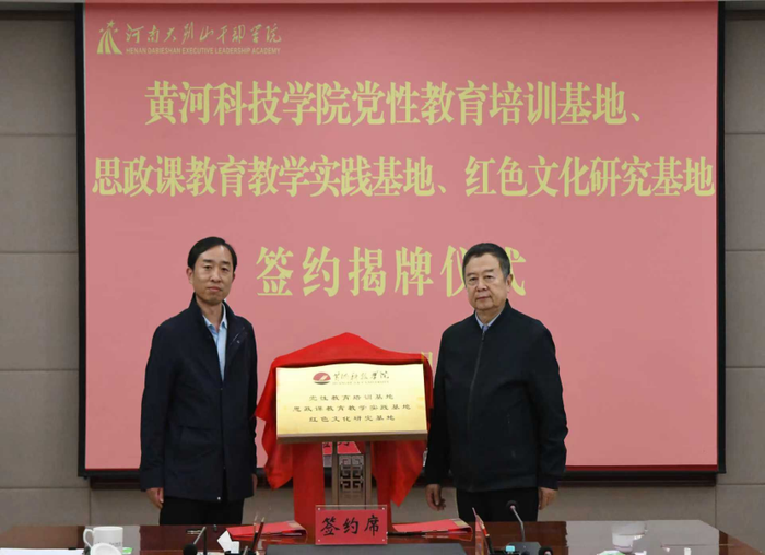 河南大别山干部学院党委副书记、副院长王勇,黄河科技学院副校长、人文思政部部长、红色文化研究中心主任于向东共同为三大基地揭牌