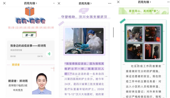 “药苑·朗读者”在战疫期间推出“我身边的战疫故事讲给你听”特别朗读系列。通过朗读身边的优秀战疫故事,用自己的声音向所有奋斗在“战疫”一线的英雄致敬。通过“药苑先锋”微信公众号推出抗疫故事系列19期,讲述了抗疫英雄如汶川白衣天使、我院铿锵玫瑰“守护者”单红晓和叶仙熙同学加入“天台新青年”等的一系列战疫故事。
