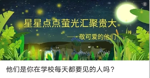 贵州大学微信公众号始终聚焦一线师生,把镜头、话筒、笔触对准校园师生,通过报道“黄大年式教师团队”系列作品,展现校长宋宝安院士创建的贵州大学绿色农药与有害生物绿色防控团队“教书育人 敢为人先”的事迹。《明天,上岸!》《高考加油!贵大等你!》等作品聚焦考研和高考话题,在热点话题中展现贵大形象。《有一种安心叫“贵大,有我在!”》《他们是你在学校每天都要见的人吗?》等作品展现保安、校车师傅、宿管阿姨等校园后勤人员的辛勤付出及校园服务故事。《用坚守祝福母校生日!用担当守护百廿贵大!》单篇阅读量高达13万+,作品深入挖掘百廿贵大校史底蕴,弘扬“明德至善,博学笃行”的校训精神,上榜中国青年报“月度文章阅读量百强”榜单。