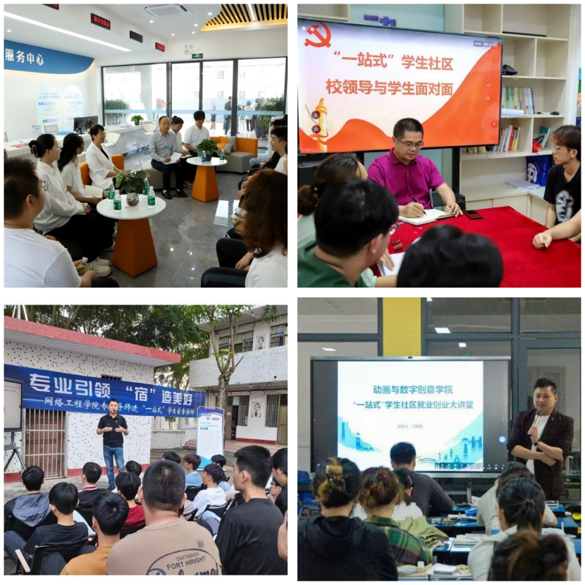 一是领导示范,校院力量深入一线。制定印发《学校领导下沉一线联系学生工作方案》,构建常态化下沉机制,通过“我与书记面对面”“我与校长面对面”等零距离交流活动,精准捕捉学生思想动态与成长诉求;二级学院书记、院长严格落实“每月三进”制度,常态化深入课堂、宿舍、工作室,聚焦学生学业发展、生活服务等核心关切,高效回应解决实际问题;创新建立“区长—楼长—层长—宿舍长”四级网格化管理体系,形成“横向到边、纵向到底”的责任闭环,确保在社区第一时间掌握学生成长动态、快速协调破解关键难题;二是骨干下沉,思政力量扎根一线。在社区建立辅导员工作站,出台《辅导员入驻“一站式”学生社区值班工作安排》,每学期平均开展谈心谈话300余次;遴选一批理论扎实、深受学生喜爱的思政教师组建社区宣讲团,创新开展“社区里的思政课”,通过专题讲座、读书沙龙、热点研讨等沉浸式交流活动,每学期开设思政专题讲座30 余场;在社区挂牌成立二级心理辅导站,配备专业心理咨询导师,系统化开展个体咨询、团体辅导、心理测评等服务,常态化举办“一月一期”心灵月读会,着力提升学生积极心理品质与综合素养;三是全程参与,导师队伍汇聚一线。组建专业化导师团队,精准提供专业选择指导、学业规划帮扶、创新创业培育等服务;广泛邀请知名学者、行业先锋榜样、企业骨干、优秀校友等社会大咖走进社区,常态化开展“校友领航・助力成长”“行业面对面”等品牌活动;统筹组织党政团干部、体育教师、后勤服务人员等力量常态化进驻社区,针对性开展政策宣讲、健康指导、生活服务等多元化活动,每学期开展跨部门协同育人活动40余场,形成全员参与、全域覆盖、全程联动的社区育人强大合力。