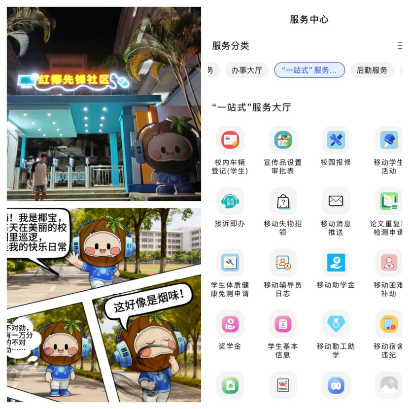 一是搭建智慧服务基座,打通数据共享渠道。以数据赋能治理为核心,统筹推进社区信息化建设,整合学工系统、后勤服务、教学管理等多部门数据资源,破除信息孤岛,通过 “今日校园”一站式服务平台,集成接诉即办、宿舍报修、事务办理、活动报名、信息查询等功能,推动 80% 以上的学生事务“线上办、掌上办”,提升服务响应效率;二是探索网络育人新媒介,提升社区育人活力。红椰先锋社区深度结合海南地域文化特色与学校计算机专业优势,打造特色鲜明的网络IP形象“智小椰”,通过卡通化、趣味化设计使其在社区公共空间、线上平台全面亮相,成为社区育人的 “数字代言人”;智汇悦馨社区创新文化表达形式,将深受学生喜爱的网红动漫形象哪吒、承载红色记忆的红色娘子军连环画等元素融入社区文化墙设计,让社区成为“可看、可感、可互动”的文化阵地;线上同步搭建易班平台、党建云平台、社区专属交流社群等数字化载体,开设云端课堂、线上研讨、主题打卡等活动,开启“线上+线下”融合的社区云端学习互动模式,有效提高社区育人的覆盖面与影响力。