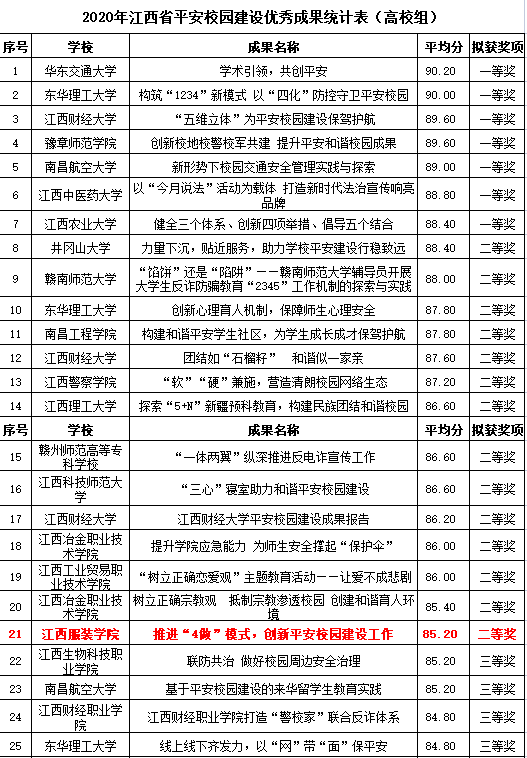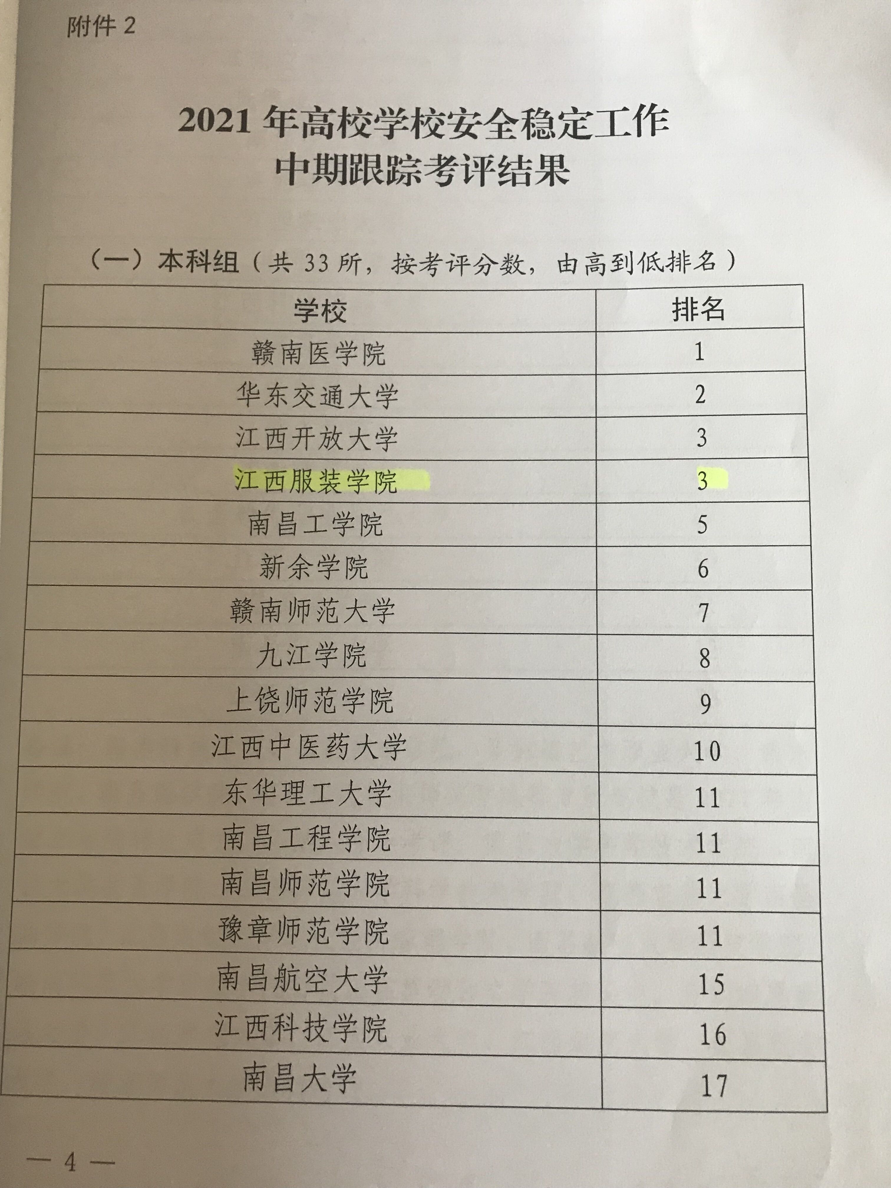 江西服装学院办学三十年来,积极推进平安校园的建设,在有特色高水平民办大学的建设上行稳致远。学校连续多年获评全省平安建设先进单位;2021年9月中旬,江西省委教育工委、省教育厅公布全省平安校园建设优秀成果结果,江西服装学院《推进四做模式,创新平安校园建设工作》获得全省二等奖;同时,在江西省2021年上半年全省本科高校学校安全稳定工作中期跟踪考评中,江西服装学院获得第三名的成绩。