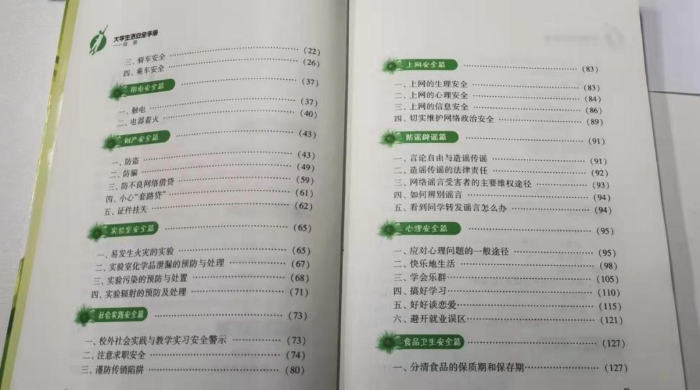 知识普及有读本。大力加强大学生安全教育和法治教育,在对校园安全案例进行分析研究的基础上,将安全知识编印成可读性强、实用性高的读本,引导大学生掌握基本的安全知识。每年为新生发放《大学生活安全手册》,对学生进行国家安全、消防安全、交通安全等教育,组织新生入学后参加校规校纪和安全知识考试,实现以考促学、以学促用,提高学生安全素养和意识能力。