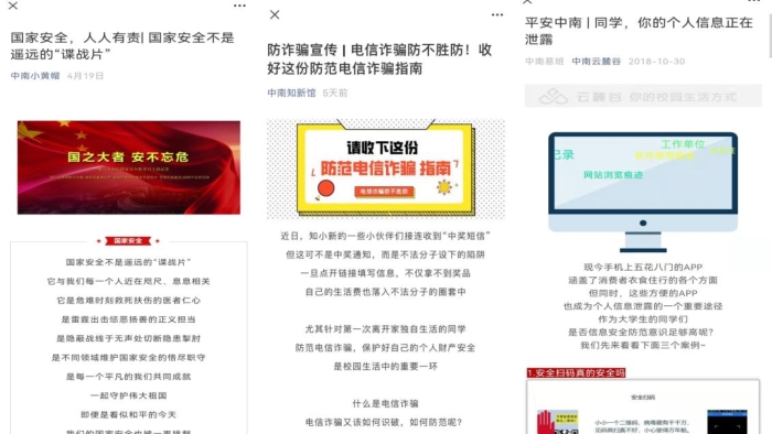 宣传教育有平台。建设“中南小黄帽”线上新媒体平台,在“中南云麓谷”微信平台上设置“平安中南”模块,利用微信、微博等线上平台,线上线下相结合,进行信息收集反馈,向学生普及国家安全、消防安全、交通安全、防范网络电信诈骗等知识。同时利用展板、宣传手册等强化线下安全知识宣传,进一步提高学生安全防范意识。
