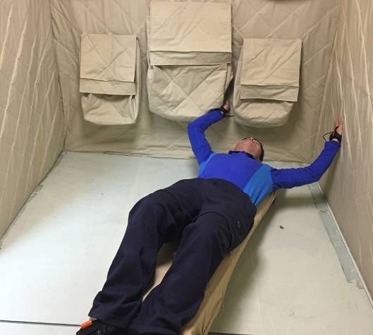 如何在地面研发太空衣?只有靠创新——服装在太空中呈现自由漂浮状态,现有的地面状态服装实验设备不能满足航天员专用服装项目研发需求,为此团队专门设计建成“着装失重感觉模拟舱”,可以在地面模拟测量航天员在失重操作状态下服装的表现及航天员生理响应、心理感受。那么如何尽可能仿真太空失重环境呢?减小摩擦力、消弭方向感,让受试者能够自由滑动模拟漂浮是关键的一步。团队李小辉副教授尝试了石材、塑料等很多材质,通过多轮组合测试,最终筛选出表面性状及可加工性均完全符合技术要求的钢化玻璃来搭载头低位万向轮滑动小车。李小辉亲自穿上专用服装,连接上各种生理参数监测传感器,躺在小车上自由运动旋转,测试模拟失重条件下专用服装的各项技术表现,“相当于把天上的任务先在地上进行演练,把问题发现、解决在地面。”李小辉说。