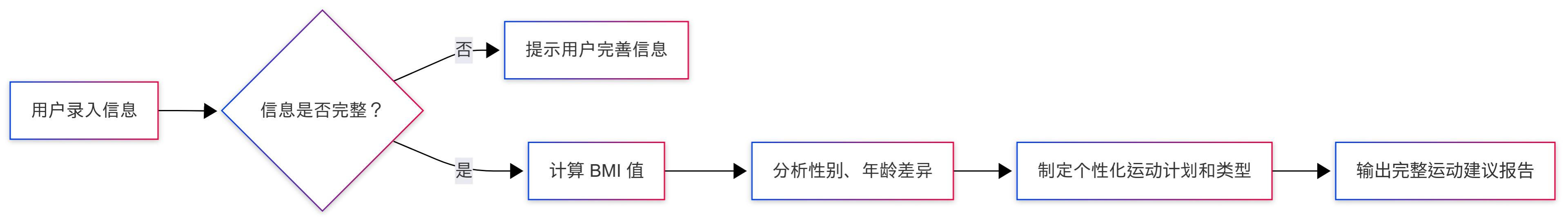 通过用户录入的姓名、性别、年龄、身高、体重等基础信息,系统基于体重指数(BMI)、代谢率估算、性别差异化建议等因素,为用户生成合理的具有个性化的运动目标、计划周期及运动建议类型。