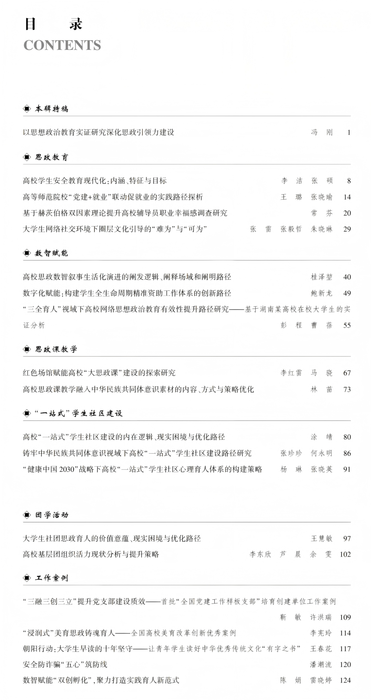 《高校思想政治工作》辑刊设置“理论前沿、热点聚焦、思想引领、党建研究、校园文化、心理教育、数智思政、生涯规划与就业指导、学生事务、‘一站式’学生社区、工作简报、典型案例、育人故事、人物访谈、评论视点”等栏目,既刊发思想政治教育学科前沿研究的理论文章,也刊发高校思想政治工作理论与实践的创新成果。