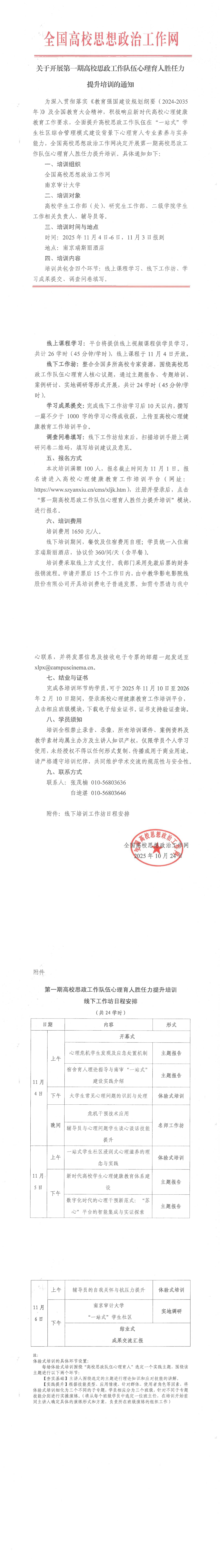 为深入贯彻落实《教育强国建设规划纲要(2024-2035年)》及全国教育大会精神,积极响应新时代高校心理健康教育工作要求,全面提升高校思政工作队伍在“一站式”学生社区综合管理模式建设背景下心理育人专业素养与实务能力,全国高校思想政治工作网决定开展第一期高校思政工作队伍心理育人胜任力提升培训。具体通知如下: