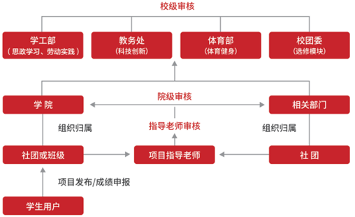 2.严格规范第二课堂教育过程管理。按照分模块管理、分模块审核的原则,明确项目质量标准和发布要求,建立“指导老师—院系负责人—模块负责人”三级审核机制,“项目发布—成绩提交”双重审查机制,确保审核过程可记录、可追溯、可查询,实现对学生参与、教师指导经历和成果的客观记录、科学评价、精准认证,保证了“第二课堂成绩单”成绩客观、全面、真实。