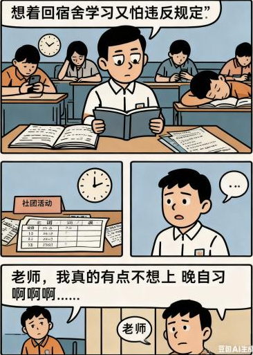 一是在教室常对着课本发呆,看有的同学刷手机、睡觉,自己也静不下心,越待越迷茫;二是觉得晚自习没意义,想着回宿舍刷题、看网课可能更高效,又怕违反规定,卡在“不想去”和“不得不去”之间,特别矛盾;三是按点往返教室占了不少自由时间,社团有临时任务或想补课程,都得先顾着晚自习,心里蓝瘦啊。