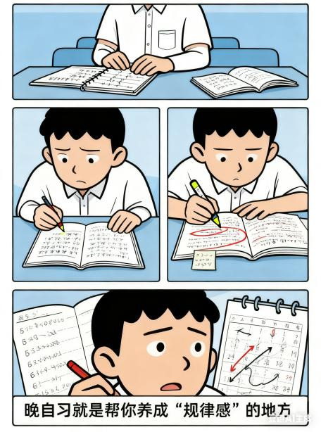 晚自习是帮你养成“规律感”的地方。建议你不用给自己定多复杂的目标。例如每天花半小时整理当天的课堂笔记,把模糊的知识点标清楚;再花四十分钟看看当天没吃透的课本内容,把不懂的地方圈出来;剩下的时间再梳理下第二天的课程重点,知道要带哪些书、提前看哪些预习内容。这些小事攒起来,就能帮你慢慢找到大学学习的节奏,不再像没头苍蝇似的慌慌张张。所以别把晚自习当负担,把它当成帮你找节奏的“小助手”,就不会觉得难熬啦。