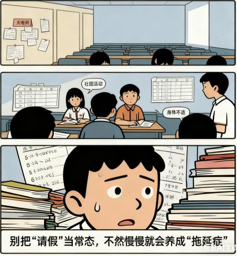 可晚自习教室不一样,这里有“天然的专注氛围”。哪怕你刚开始不想学,看着身边同学都在低头写题、翻书,你也会不自觉地拿出课本;遇到不懂的地方,转头问同桌一句,说不定比自己死磕半小时还管用。而且晚自习也不是“铁板一块”,要是社团有重要活动、或者身体不舒服,按流程请假就行。但别把“请假”当常态哟!不然慢慢就会养成“拖延症”,期末复习时可就慌啦。
