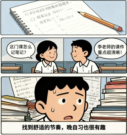 哪怕每天只看几页专业课书籍,也能慢慢攒下知识;想练技能?带个笔记本写写字、整理第二天的课程表,甚至把当天的错题抄下来,都比发呆强;实在不想学课本?和周围同学交流一下“这门课怎么记笔记”“哪个老师的课件更有用”,也能收获不少。重要的不是“在晚自习学了多少”,是找到“自己舒服的学习方式”。就像玩游戏要找适合自己的角色,学习也得找适合自己的节奏。慢慢摸索,你就会发现晚自习其实挺有意思的。