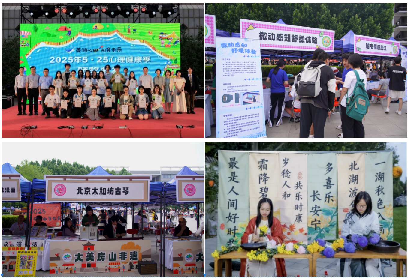除二十四节气涵育身心活动之外,在中国重要传统节日期间,打造具有集体文化认同感的心理育人大型活动。如:端午节“创意集市”,设置心灵摆渡、非遗文化、奇妙际遇等7个区域,邀请来自北京和山西方山的十余位非遗传承人现场展示掐丝珐琅画、手工篆刻印章等非遗技艺;中秋节“北湖雅集”,设置朱钗粉黛、海棠市集、茗香品茶、廊桥灯谜等打卡点,复现了“香、茗、琴、诗、书”等中华古典文化元素,师生们通过观赏古琴、歌曲、茶道、舞蹈等节目表演,体验诗词、灯谜、漆扇等活动项目,以中华优秀传统文化涵育心境。