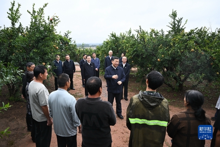 9月24日,中共中央总书记、国家主席、中央军委主席习近平在浙江考察结束返京途中,来到山东省枣庄市考察。这是习近平在位于峄城区的冠世榴园石榴种植园了解石榴产业发展情况。新华社记者燕雁摄