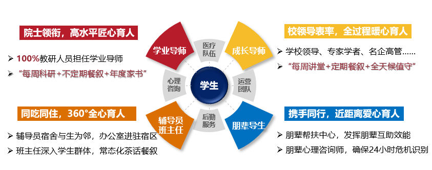 超前布局,把学生社区物理空间布局和校区建筑规划设计深度融合,将“有效度”的管理融入“有温度”的服务,让学生“足不出户”即可拥有全人教育成长空间,尽享优质服务和精细管理。一是推动“网格化”实现社区“大平安”。坚持党建引领,推动党团组织网格化,将支部建在学生社区,网格化延伸管理触角,将网格打造成最小单元的“根据地”“责任区”,将更多学生团结在党的周围。学生党员、入党积极分子100%参与,组建青年突击队、设置党员先锋岗、成立社区学生管理服务委员会,打造“党群团”一体协作战线,共同坚守疫情防控等社区安全一线,全面承担社区日常服务工作,保障管理不掉线、服务不断线,创下疫情防控期间“零感染”、教学“零事故”、校园安全“零事故”的成绩。二是推动“精细化”迎来学生“好口碑”。深化“现代书院制”和“全员导师制”建设,为学生分别配备学业导师、成长导师、朋辈导生,因材施教、全员进驻,做到同层必有导师,全过程相伴成长,为学生个性化的发展需求提供解决方案。打造“50米文化养成圈”“100米运动成长圈”,配置人文艺术区、体育运动区、生活配套区、商业服务区等,融入红色文化、创新文化、博雅文化与国际文化等多元文化体验,打造博雅学堂、博约讲堂、知行课堂等社区精品活动271场次,逾4.1万人次参与,服务学生全面发展。三是推动“信息化”实现服务“一站式”。健全学生社区治理智慧服务体系,让“信息多跑路,师生少跑腿”。有困难,智慧服务平台、师生服务中心“一站式”解决;有建议,“一键话你知”“解忧杂货店”邮箱、24小时服务驿站365天连线,实时回应学生关切;有烦恼,24小时服务热线“5+2”“白+黑”全时候机,学生真实感受到“服务就在身边”“关爱就在身边”。“一份表”学生全生周期管理系统、“一张网”校园学生数据分析系统、“一体化”学生信息综合应用系统,实时展现学生的成长轨迹,为学生“认知自我,规划未来”提供精准服务。